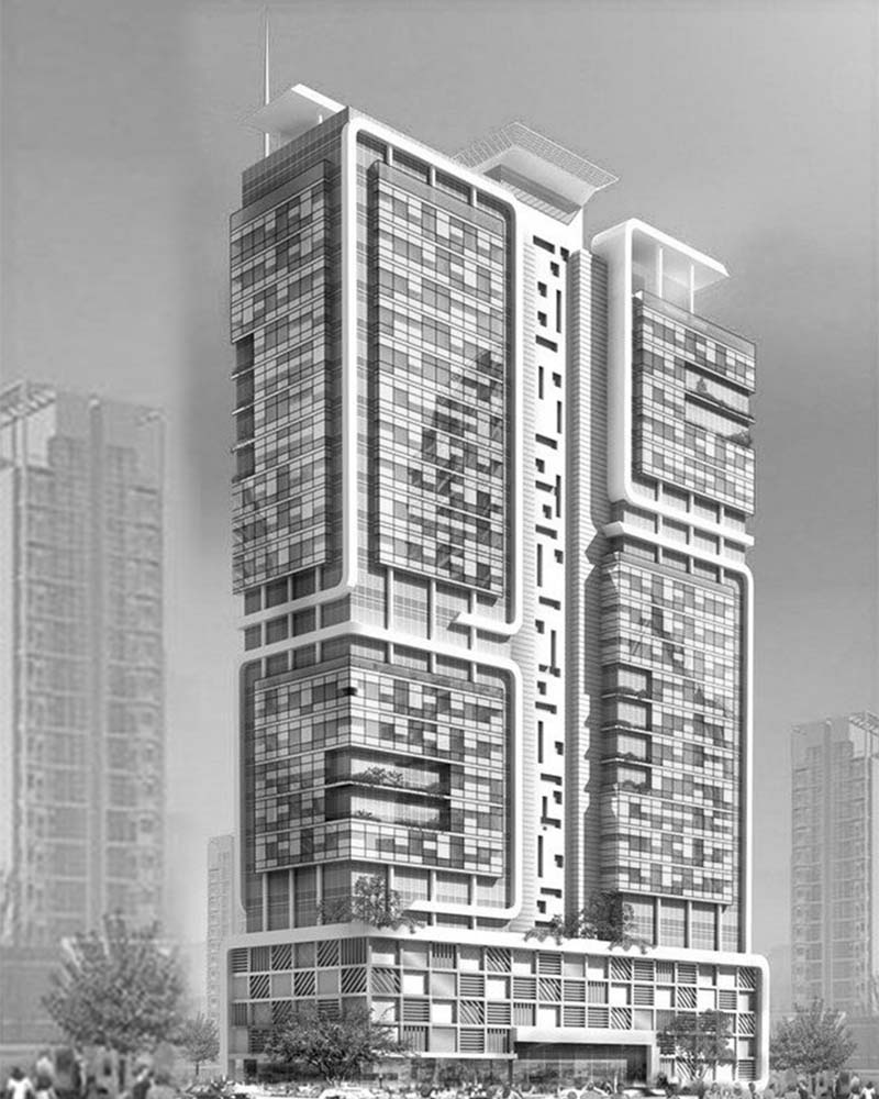 It consists of 1 basement parking floor, ground floor (for the main entrance , retail & electromech. rooms) , 5 typical parking floors and 20 typical offices floors.
